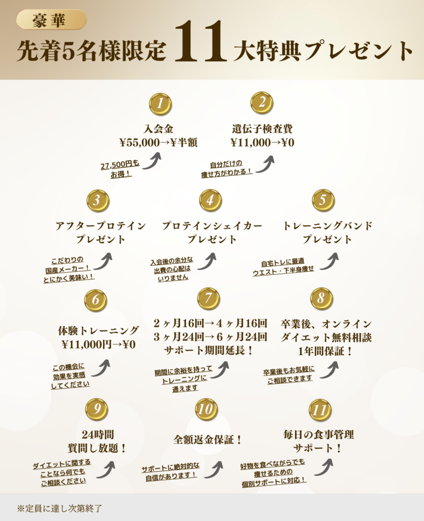 予約環境や、パーソナルトレーニングの質とお客様の満足度を保つ為、姫路店では毎月のご入会を"5名様限定"とさせていただいております。